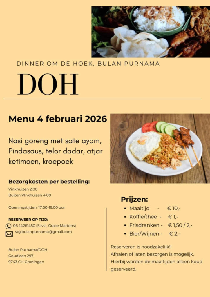 Hierbij ingesloten stuur ik u het menu van 04-02-2026. Het menu van 12 bestaat uit: Nasi Goreng met sate ayam, pindasaus, telor dadar, atjar timun, kroepoek. De ingrediënten kunt u lezen in de bijgevoegde flyer.